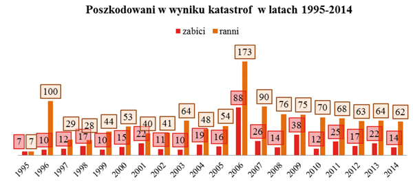 W wyniku wszystkich katastrof, jakie wydarzyły się w latach 1995-2014, poszkodowane zostały ogółem 1654 osoby, w tym: 405 poniosło śmierć, a 1249 zostało rannych (rys. 2).