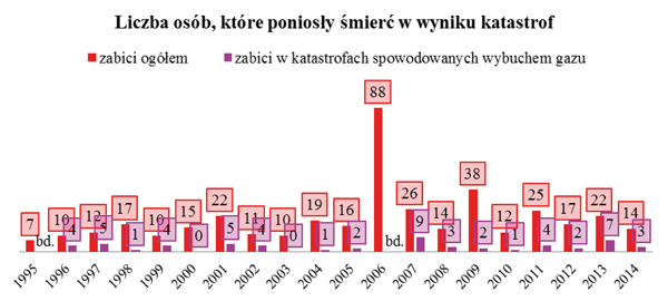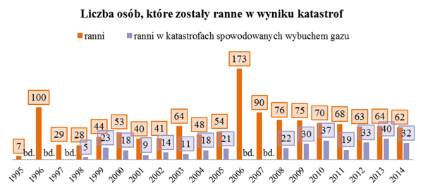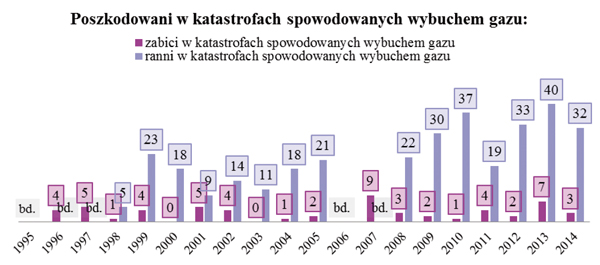 [2] Brak danych dotyczących osób, które poniosły śmierć w wyniku wybuchu gazu w latach 1995 i 2006, oraz rannych w latach: 1995, 1996, 1997, 2006 i 2007.