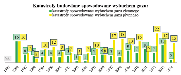 Według statystyk prowadzonych od 1995 r w GUNB na 6368 wszystkich zarejestrowanych w ostatnim dwudziestoleciu katastrof budowlanych 332 spowodowanych było wybuchem gazu, co stanowi 5% ogółu [8] (rys. 1).