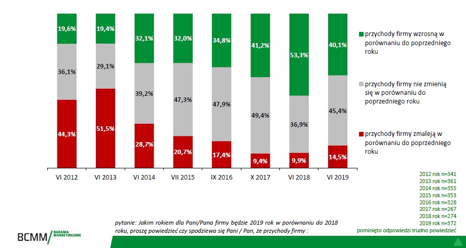 Według najnowszej edycji raportu – „Nastroje wykonawców 2019” – odsetek firm branży budowlanej, które spodziewają się w 2019 roku wzrostu swoich przychodów, wynosi 40%, co stanowi spadek o 13 punktów procentowych w porównaniu do roku ubiegłego. Do 14% wzrósł odsetek firm, które przewidują, że ich przychody w nadchodzącym roku zmaleją (10% w roku 2018).