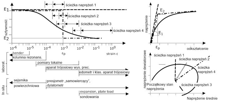 Choć prEN 1997-2:202x kładzie wyraźny nacisk na rolę projektanta geotechnika w wyborze metody badań, ich zakresu i dopasowania, oraz interpretacji wyników, to zawiera wiele przydatnych wytycznych uwzględniających aktualny stan wiedzy w tym obszarze. Jest to widoczne zwłaszcza w kluczowych rozdziałach dotyczących wytrzymałości i sztywności gruntu. Wprowadzone zostały terminy parametrów wytrzymałościowych maksymalnych (ang. peak), przy stałej objętości (ang. constant volume) i rezydualnych (ang. residual) dla różnych kryteriów zniszczenia. Wyraźnie podkreślono: konieczność opisu sztywności gruntu w stosownym przedziale naprężeń/odkształceń, jej nieliniowość, efekt czasowy i stosowalność w analizie danego stanu granicznego (rys. 2).