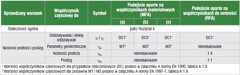 Tab. 2. Zestaw współczynników częściowych do sprawdzenia nośności – przykład dla fundamentów bezpośrednich w trwałej i przejściowej sytuacji obliczeniowej [6, tab. 5.2]