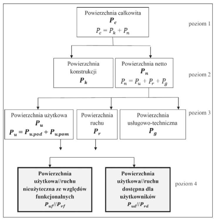 Powierzchnię całkowitą, jako podstawową dla budynku, można umownie zaliczyć do poziomu pierwszego, a na poziomie drugim wydzielić z niej powierzchnię konstrukcji i powierzchnię netto. Trzeci poziom to dalszy podział powierzchni netto na powierzchnie: użytkową, ruchu i usługowo-techniczną. Na tym poziomie powierzchnię użytkową dzieli się również na powierzchnię użytkową podstawową i powierzchnię użytkową pomocniczą.