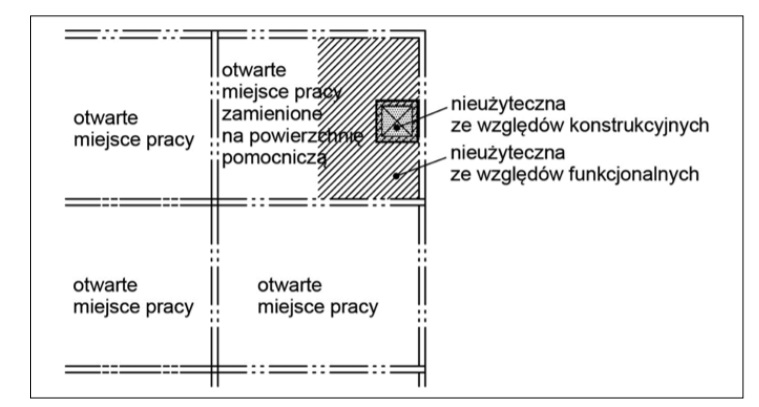 W PN-ISO 9836:2015 [1] przedstawiono dwa przykłady praktycznego wykorzystania powierzchni nieużytecznej przy projektowaniu budynku biurowego: pierwszy dotyczący powierzchni nieużytecznej ze względów konstrukcyjnych, a drugi – powierzchni nieużytecznej ze względów funkcjonalnych.