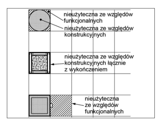 Przyczynami powodującymi utratę przez pewne fragmenty powierzchni cech umożliwiających normalne ich użytkowania mogą być zarówno względy funkcjonalne, jak i względy konstrukcyjne. Wynikiem tego jest wyodrębnienie dwóch rodzajów powierzchni nieużytecznej, a mianowicie: powierzchni nieużytecznej ze względów funkcjonalnych i powierzchni nieużytecznej ze względów konstrukcyjnych. Na prezentowanych rysunkach, przeniesionych bezpośrednio z normy [1], zaznaczone są te dwa rodzaje powierzchni nieużytecznej. W artykule ograniczono się do szczegółowego omówienia powierzchni nieużytecznej ze względów funkcjonalnych.