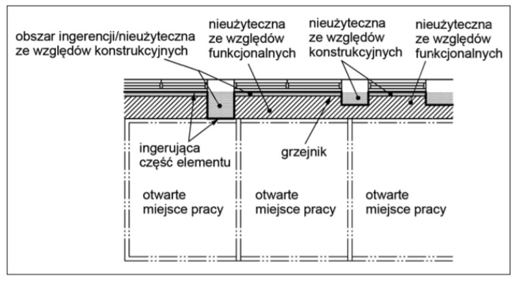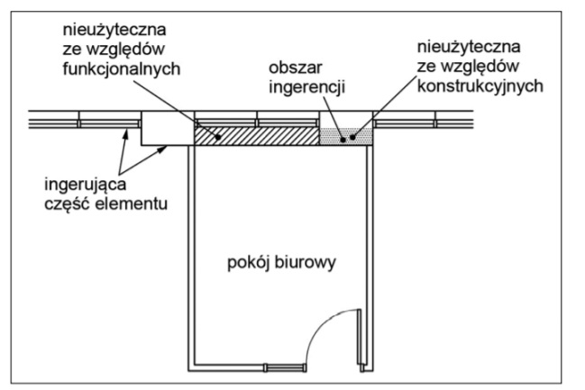 • Następuje ingerencja elementów konstrukcyjnych zaburzających korzystny kształt użytkowanej powierzchni wewnątrz budynku, jak np. słupy, pilastry, filarki międzyokienne. Dotyczy to przestrzeni znajdujących się blisko lub między wymienionymi elementami; przypadki takie pokazano na rys. 2-5 [1].