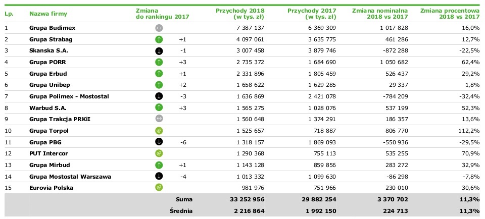 Liderem rankingu piętnastu największych spółek na polskim rynku, podobnie jak w poprzednich latach, jest Grupa Budimex, której przychody osiągnęły poziom 7,4 mld zł, co stanowiło aż 16 proc. wzrost w porównaniu do 2017 roku. Na drugim miejscu znalazła się Grupa Strabag z przychodami na poziomie 4,1 mld zł (wzrost o około 12,7 proc.). Ostatnie miejsce na podium zajęła Skanska S.A., uzyskując przychody na poziomie 3 mld zł.