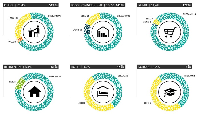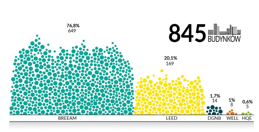 W zestawieniu przewodzi, podobnie jak w poprzednich latach, certyfikacja BREEAM, z prawie 77-procentowym udziałem (3-procentowy wzrost w skali roku). W LEED certyfikowanych jest 20% budynków, w DGNB 1,7%, w WELL 1%, a w HQE 0,6%. Liczba certyfikowanych obiektów w Polsce wynosi 845 budynków.