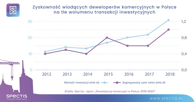 Z raportu firmy badawczej Spectis zatytułowanego „Deweloperzy komercyjni w Polsce 2019-2023” wynika, że w latach 2012-2018 zagregowany poziom rentowności netto liczony dla grupy 30 wiodących deweloperów biurowych, handlowych i magazynowych działających w Polsce wahał się pomiędzy 17% a 26%, co daje średnioroczny wynik na poziomie 21%.