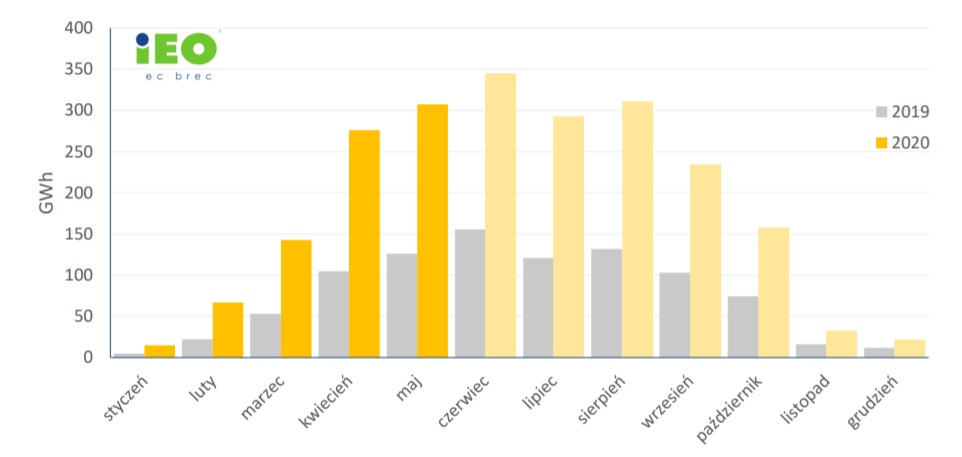 Polska w 2019 roku osiągnęła przyrost nowych mocy na poziomie około 0,9 GW i z udziałem przyrostu mocy wynoszącym 5,5% uplasowała się w pierwszej piątce w Unii Europejskiej. Według prognoz IEO Polska w 2020 r. utrzyma tempo wzrostu mocy zainstalowanej i utrzyma się na 5. miejscu w UE. IEO ocenia, że na koniec 2020 roku moc zainstalowana w PV w Polsce może osiągnąć 2,5 GW. Prognozy IEO wskazują także, że obroty na rynku fotowoltaiki wzrosną w 2020 roku stosunku do poprzedniego nawet o 25% i przekroczą 5 mld zł.