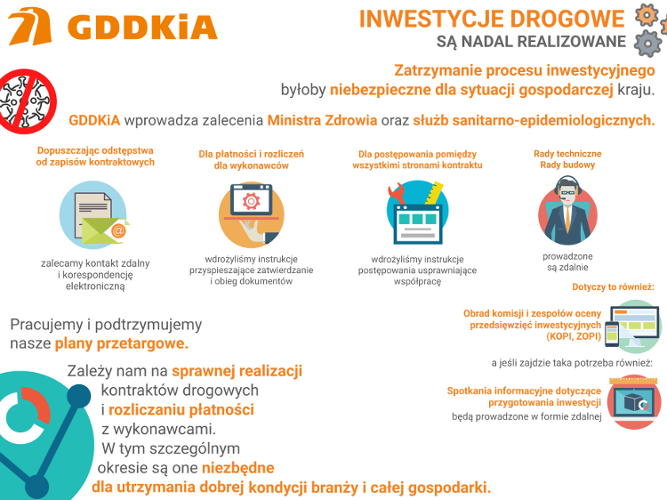 Dyrektorzy oddziałów GDDKiA otrzymali stosowne wytyczne i przekazali je wykonawcom oraz inżynierom kontraktów w celu usprawnienia realizacji kontraktów i umów. Generalna dyrekcja wspólnie z organizacjami branżowymi oraz podmiotami zaangażowanymi w proces inwestycyjny szuka rozwiązań ułatwiających funkcjonowanie podczas stanu epidemii. W zależności też od rozwoju wydarzeń będzie na bieżąco podejmować odpowiednie decyzje.