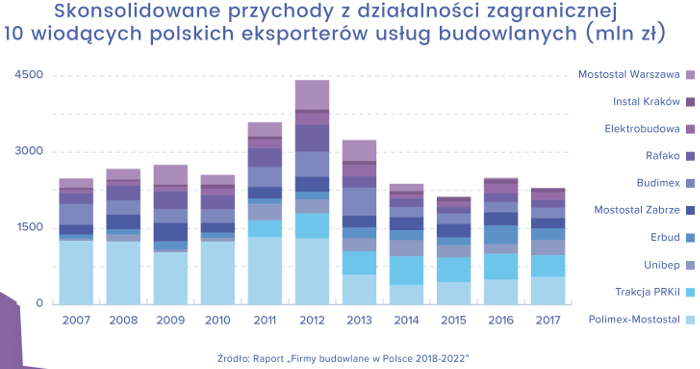 Co ciekawe, wzrost przychodów z tytułu działalności eksportowej w latach 2016–2017 nie jest zasługą największych firm budowlanych, lecz skutkiem wzmożonej aktywności zagranicznej mniejszych firm wykonawczych. Z analizowanej w raporcie grupy 40 największych firm budowlanych, regularną aktywnością na rynkach zagranicznych pochwalić się może mniej niż połowa podmiotów. Tak niski odsetek spowodowany jest częściowo tym, że wśród wiodących wykonawców dużą grupę stanowią polskie oddziały firm międzynarodowych, które często prowadzą już działalność w krajach sąsiadujących z Polską poprzez odrębne spółki nadzorowane z centrali grupy.