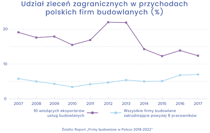 Co istotne, w minionych latach miała miejsce wyraźna zmiana, jeżeli chodzi o strukturę podmiotów realizujących zlecenia zagraniczne – środek ciężkości przesunął się z największych grup budowlanych na mniejsze i bardziej wyspecjalizowane podmioty.