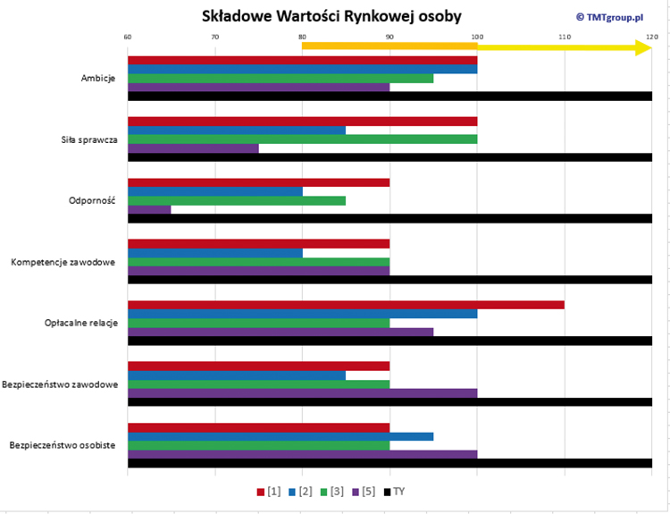 [1] – prezes firmy, a następne osoby zajmują stanowiska na kolejno niższych piętrach w hierarchii. Każdą osobę zwymiarowaliśmy w relacji do pracowników na podobnych stanowiskach. Grupa 80-100% (ciemnożółty pasek) zawiera 20% najlepszych na rynku osób o podobnych stanowiskach i zakresach działalności.