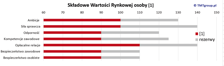 Niepokoi jednak niższa niż poprzednio omówione parametry odporność na stres, trudności i niepowodzenia (90%). Taki wynik oznacza, że osoba [1] będzie płaciła za swoje sukcesy zawodowe rosnącym obciążeniem psychicznym i zmęczeniem. Może to powodować większą zmienność jej nastrojów. Pozostałe parametry, tj. kompetencje zawodowe, bezpieczeństwo zawodowe i osobiste – także ma na poziomie 90%. Parametry te wymagają pilnego rozwoju, gdyż będą zwiększały ryzyka i obniżały efektywność działania tej osoby. Warto zauważyć, że ma ona wszędzie duże rezerwy i jeśli będzie zdecydowana je uruchomić, to znajdzie się w elitarnej grupie 1 promila najlepszych.