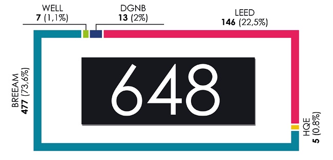 Liderem zestawienia jest BREEAM z prawie 74-procentowym udziałem, kolejne systemy to LEED: prawie 23%, DGNB 2%, WELL 1%, a HQE 0,8%. Wart podkreślenia jest roczny wzrost liczby budynków, który osiągnął 29% (rok wcześniej było to 23%). Liczba ta obrazuje wyraźną dynamikę wzrostu powszechności stosowania certyfikacji.