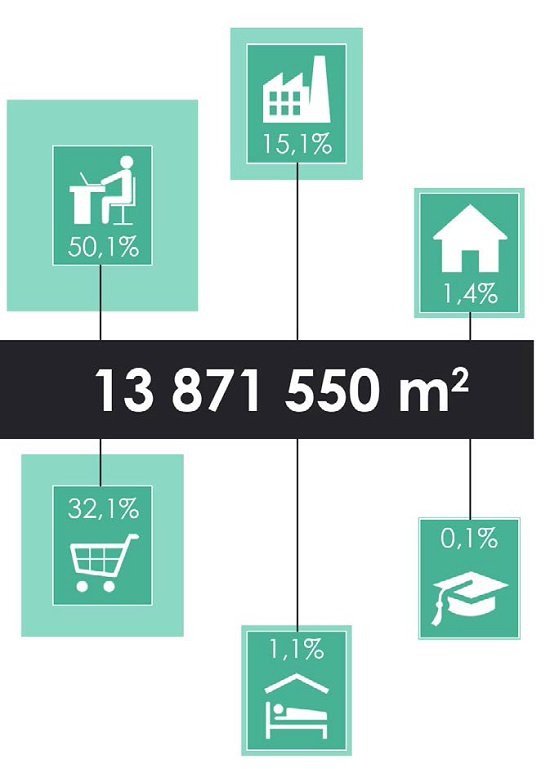 W podziale powierzchni na poszczególne sektory rynku widać, że nieruchomości biurowe stanowią 50%, zaś udział nieruchomości handlowych wynosi 32%.