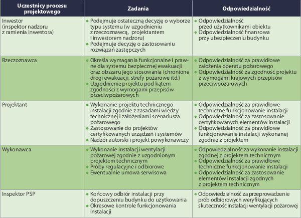Sprawczą rolę przy podjęciu decyzji o wyborze systemu oddymiania ma inwestor. Od niego zależy dystrybucja środków finansowych, co w praktyce oznacza wybór rozwiązań najtańszych, o ile spełniają one minimalne wymogi przepisów i firm ubezpieczeniowych. Inwestor przed podjęciem ostatecznej decyzji powinien mieć jednak świadomość całkowitych kosztów związanych z realizacją każdej z oferowanych instalacji wentylacji pożarowej. W praktyce częstym wybiegiem jest oferowanie tylko elementów lub częściowego systemu bez podawania informacji o infrastrukturze koniecznej dla prawidłowego działania instalacji (np. kosztów dodatkowego okablowania, automatycznego sterowania lub niezbędnych dodatkowych prac budowlanych). Innym czynnikiem mającym wpływ na całkowity koszt instalacji może być konieczność wprowadzania znacznych korekt do działania układu, po nieudanych próbach pożarowych (sytuacja taka zdarza się nad wyraz często). W podjęciu prawidłowej decyzji powinien pomóc inwestorowi rzeczoznawca ds. zabezpieczeń przeciwpożarowych, który będzie opiniować projekt techniczny instalacji w budynku. Zadaniem rzeczoznawcy jest m.in. uświadomienie inwestorowi, że wybrana instalacja oprócz względów ekonomicznych musi spełniać wymogi przepisów przeciwpożarowych oraz gwarantować dobre warunki ubezpieczenia obiektu. Zgodność zawartych w projekcie technicznym rozwiązań z przepisami oraz sprawdzenie, czy zastosowane elementy instalacji spełniają wymogi ustawy o ochronie przeciwpożarowej (wraz z aktami wykonawczymi), są właśnie w kręgu odpowiedzialności rzeczoznawcy ds. zabezpieczeń przeciwpożarowych. Jego zadaniem jest również określenie wymagań minimalnych systemu dla konkretnego obiektu, które stanowią podstawę założeń do wykonania projektu technicznego instalacji. Tu odpowiedzialność przejmuje projektant. On wraz z wykonawcą ponoszą największą (w zasadzie jako jedyni) odpowiedzialność za prawidłowe działanie instalacji na etapie prób odbiorowych, a przede wszystkim podczas rzeczywistego zagrożenia i we własnym interesie powinni bronić sprawdzonych oraz skutecznych rozwiązań. Często jednak rozwiązania systemowe są narzucane projektantom przez inwestora lub rzeczoznawcę. Jeżeli propozycje te dają gwarancję bezpieczeństwa instalacji i są zgodne z zasadami sztuki inżynierskiej, to nie ma większego problemu. Jeśli jednak przeczą zarówno zasadom tej sztuki, jak i prawom fizyki (a tak czasami bywa), uprawniony projektant nie może ich akceptować. W przypadku pożaru właśnie on obarczany zostanie całą odpowiedzialnością za wadliwe działanie systemu, ponieważ tylko on odpowiada za techniczną stronę projektu. Na koniec wspomnieć również należy o roli przedstawiciela PSP, który sprawdzając kompletność dokumentacji oraz uczestnicząc w próbach odbiorowych, dopuszcza budynek do użytkowania. Jeżeli dopuszczenie wydawane jest ze świadomością niedoskonałości systemu, osoba wydająca ten dokument przejmuje na siebie część moralnej i cywilnej odpowiedzialności za użytkowników obiektu.