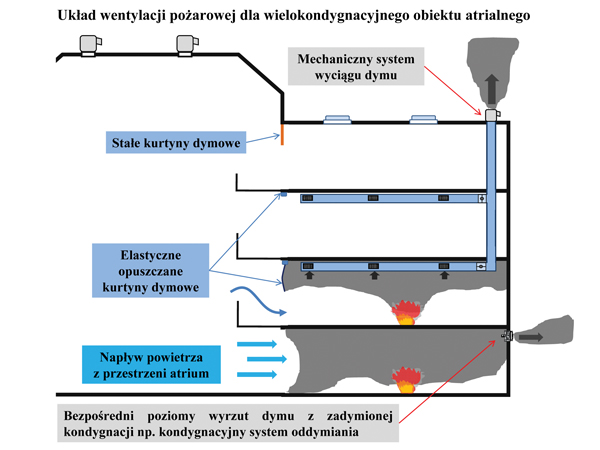 Rys. 3 Przykładowe rozwiązania systemu oddymiania dla wielokondygnacyjnego obiektu wielkokubaturowego