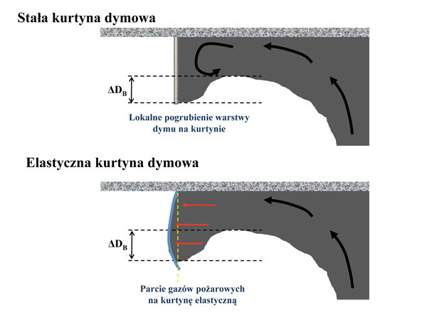 Wydzielenie stref dymowych, czyli obszarów, w których po wykryciu pożaru działać będzie system usuwania dymu, jest charakterystyczne i niezbędne właśnie dla obiektów wielkokubaturowych użyteczności publicznej. W rozległych jednokondygnacyjnych obiektach tego typu stosuje się najczęściej podział przestrzeni podstropowej z wykorzystaniem stałych ścianek kurtynowych (kurtyn dymowych) przylegających bezpośrednio do stropu pomieszczenia – tzw. kurtyn statycznych określanych skrótem SSB (ang. static smoke barriers). W obiektach, gdzie taki podział stwarzałby poważne utrudnienia komunikacyjne oraz kolidował z estetyką wnętrza, lepszym rozwiązaniem jest zastosowanie kurtyn ruchomych (aktywnych) określanych skrótem ASB (ang. active smoke barriers). Przechodzą one automatycznie z pozycji zrolowanej (złożonej) do pozycji rozwiniętej (pożarowej pozycji działania) z chwilą otrzymania sygnału z centrali sterowania pożarowego. Należy przypomnieć, że omawiane elementy systemu wentylacji pożarowej (pomimo czasem bardzo prostej konstrukcji) nie mogą mieć przypadkowych rozmiarów i być wykonane z dowolnych niepalnych materiałów. Kurtyny dymowe niezależnie od zastosowanych do ich wykonania materiałów muszą spełniać wymogi normy PN-EN 12101-1, a ich wysokość powinna być ustalona na podstawie obliczenia grubości warstwy dymu w zasobniku oraz zjawiska spiętrzenia dymu na kurtynie (rys. 4).