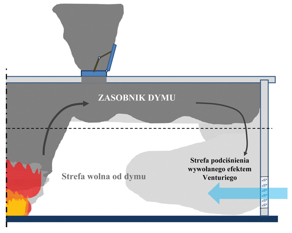 Należy podkreślić, że prędkość 5 m/s może być przyjmowana wyłącznie w przypadku systemów oddymiania mechanicznego i dla otworów o dużym przekroju (drzwi i bramy wjazdowe). Mniejsze otwory kompensacyjne przy przepływie powietrza z taką prędkością zaczynają zachowywać się jak zwężka Venturiego, co oznacza możliwość podsysania dymu z zasobnika w strefie za otworem i wtłaczania go do przestrzeni chronionej (rys. 5).