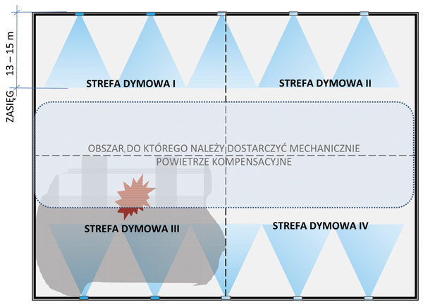 - Dokonać wyboru sposobu realizacji oddymiania dużych powierzchni w zależności od przeznaczenia obiektu i układu architektury wewnętrznej (obiekty wielkoprzestrzenne wolno stojące i stanowiące część innego obiektu, handlowe, atria wewnętrzne). Przy wyborze systemu oddymiania należy pamiętać o ograniczeniach wynikających m.in. z wysokości obiektu. Systemy grawitacyjne mogą być skuteczne w obiektach do 2–3 kondygnacji i wysokości całkowitej ok. 12 m. Pomimo mniejszej skuteczności w początkowej fazie pożaru (wynikającej z niedostatecznych warunków termicznych) mają jednak pewną zaletę w stosunku do oddymiania mechanicznego. Chodzi tu o pewną elastyczność, jeżeli pożar w budynku przekroczy zakładaną projektem moc, przez klapy dymowe może wydostać się zwiększona ilość dymu napływającego do zasobnika. Skuteczniejsze dla wyższych obiektów i w całym czasie trwania pożaru wentylatory oddymiające takiej elastyczności nie mają. Duża grupa obiektów wielkokubaturowych (np. galerie handlowe) wymaga jednoczesnego zastosowania różnych systemów oddymiania. Zadziałanie konkretnej konfiguracji instalacji uzależnione jest w tym przypadku od lokalizacji pożaru, tak jak pokazano na rys. 3.
