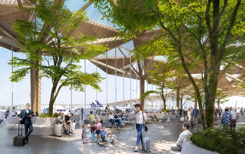 Architekci postawili na zrównoważony rozwój, planując zastosowanie m.in. ogrzewania i chłodzenia z wykorzystaniem gruntowych pomp ciepła, wytwarzanie biopaliwa, zbieranie wody deszczowej i odpływowej oraz zastosowanie elektrycznych pojazdów do obsługi płyty lotniska. Jednocześnie położyli nacisk na dostęp do naturalnego światła i szerokie zastosowanie zieleni, przy czym jedną z ich inspiracji było lotnisko Changi w Singapurze. To dlatego pośrodku budowli zaplanowano dużo zieleni utrzymywanej przez cały rok, a nawet zbiornik wodny, dostępny z drewnianego pomostu, na który da się wejść z różnych części terminalu. Wszystko po to, żeby zrelaksować się przed podróżą.