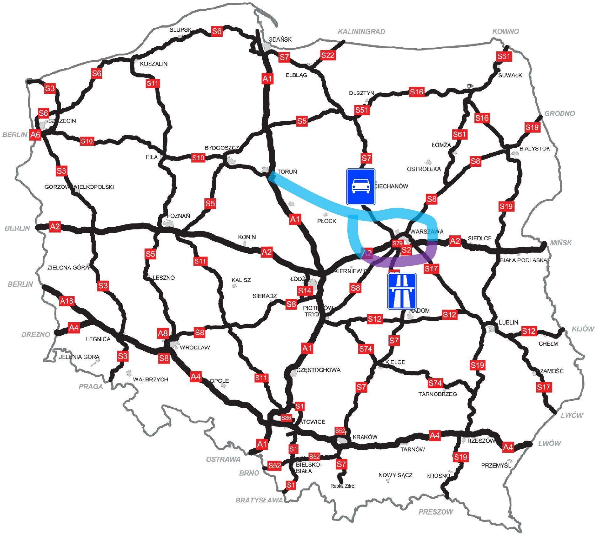 - Wariant 1: A1 (Toruń – proponowany węzeł Grabowiec) – Płock – Obwodnica Aglomeracji Warszawskiej – OAW (opcja w sąsiedztwie m. Tłuszcz), o długości 380 km, z czego ok. 100 km jako autostrada, szacunkowa wartość całej inwestycji to 24,1 mld zł,