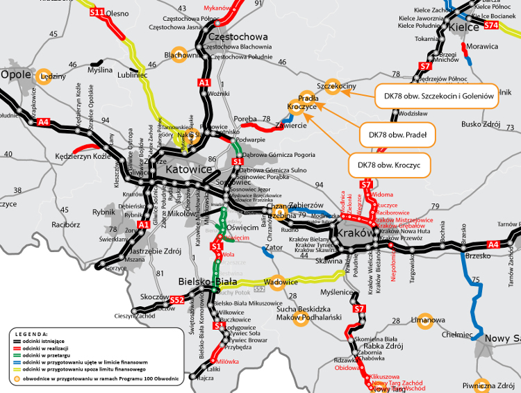 GDDKiA ogłosiła przetargi na wykonanie kompleksowej dokumentacji projektowej dla realizacji obwodnic Kroczyc, Pradeł, Szczekocin i Goleniów w ciągu DK78. Łączna długość planowanych dróg wyniesie blisko 25 km.