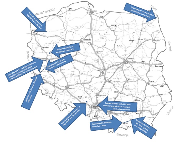 Ministerstwo Infrastruktury przedstawiło 10 programów inwestycji dla zadań na sieci dróg krajowych o łącznej wartości 582 mln zł. Będą to rozbudowy odcinków dróg, wzmocnienia nawierzchni, rozbudowa skrzyżowań, budowa przepustów, chodników.