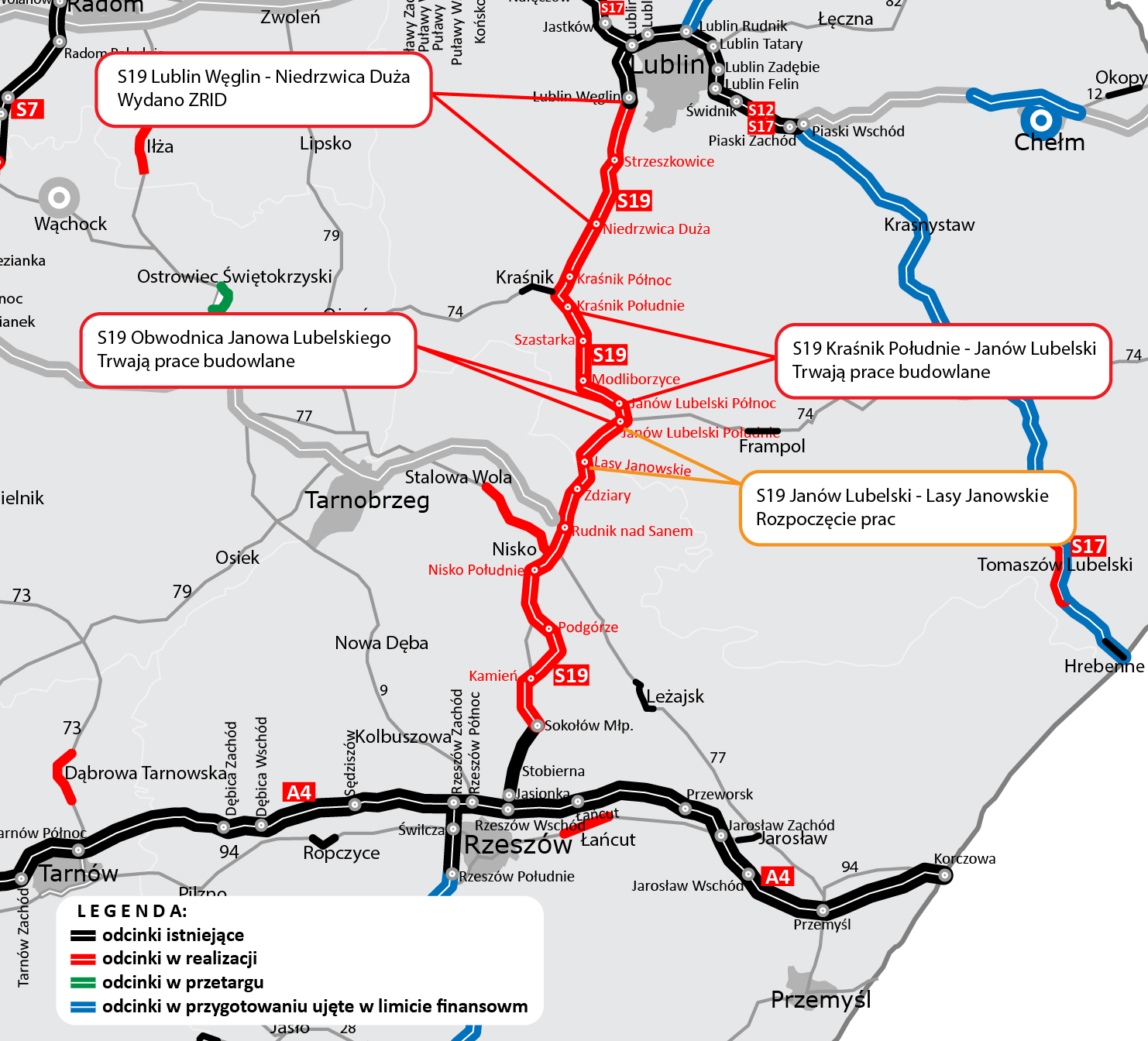 W realizacji jest już około 130 km drogi S19 pomiędzy Lublinem i Sokołowem Małopolskim. Budowę podzielono na 12 odcinków, po sześć w województwie lubelskim i podkarpackim. We wrześniu 2019 rozpoczęly się prace na odcinku od węzła Janów Lubelski Południe do węzła Lasy Janowskie.