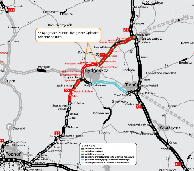 Oddano kolejny odcinek trasy S5 w woj. kujawsko-pomorskim. To 15-kilometrowy fragment od węzła Bydgoszcz Północ do węzła Bydgoszcz Opławiec.