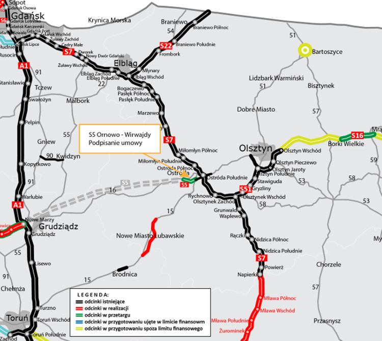 - 1 czerwca 2017 r. – podpisanie umowy na wykonanie koncepcji programowej oraz projektu budowlanego i wykonawczego dla odcinka S5 Ornowo–Wirwajdy,