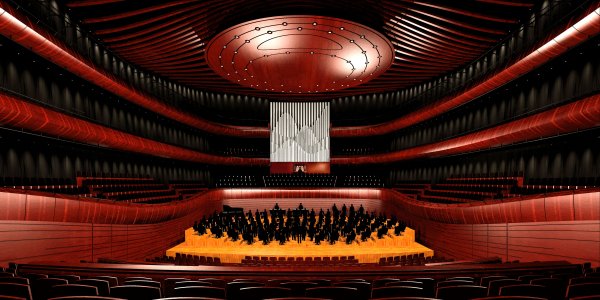 Przestrzeń foyer została powiększona poprzez nadanie ścianie czołowej wielkiej sali koncertowej wypukłego kształtu z podcięciem u dołu. Zapewnienie stabilności tej części konstrukcji było możliwe dzięki zastosowaniu modelowania przestrzennego.