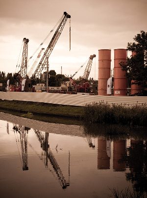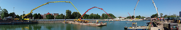 Fot. 10 Widok na budowę – przepompowywanie betonu z pompy na brzegu do pompy na platformie pływającej