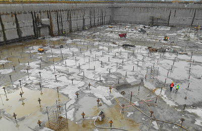 – mikropali samowiercących, kotwiących korek betonowy oraz przyszłą płytę fundamentową budynku. Mikropale zostały wykonane z jednostek pływających przy współpracy z nurkami, a ich zadaniem jest tymczasowe zakotwienie korka betonowego oraz docelowe zakotwienie płyty fundamentowej budynku dla zrównoważenia wyporu wody;