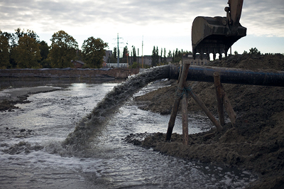 – do gruntów piaszczystych używano maszyny urabiającej grunt przy użyciu tzw. water jet. Grunt był spulchniony przez podawanie wody pod bardzo dużym ciśnieniem, a następnie, przy użyciu systemu rur i pomp, transportowany na pole refulacyjne do odsączenia;