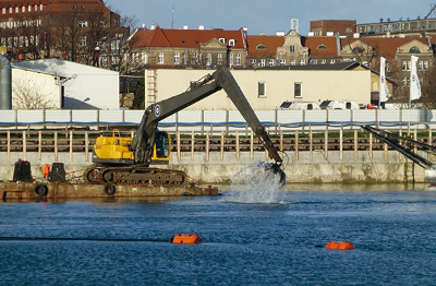 Podczas prowadzenia prac natrafiono na warstwę kamieni, do której usunięcia używana była koparka zainstalowana na pływającej barce i stale pracująca z pogłębiarkami, aby zapewnić odpowiednią ilości wydobywanego urobku każdego dnia.