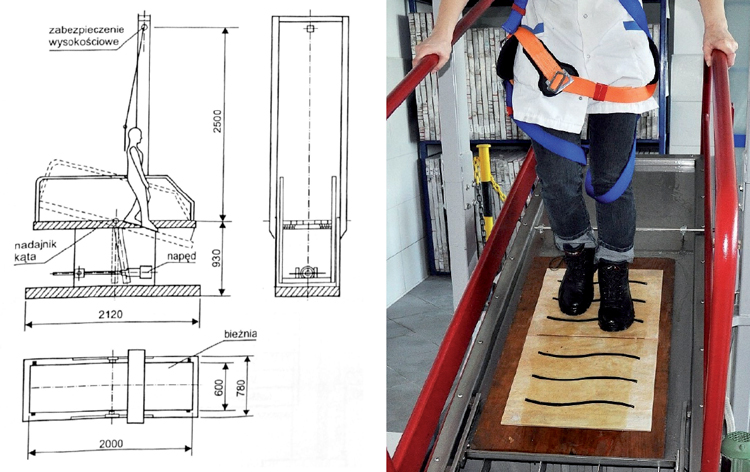 Wejście Polski do Unii Europejskiej spowodowało przyjęcie wielu nowych norm z innych krajów członkowskich. Najczęściej korzysta się z uregulowań niemieckich, np. normy DIN 51130:2004 [5] – stosując tzw. test pochylni. Metoda została także opisana w Polskiej Normie PN-EN 13845 [12]. Zasada metody jest następująca: badacz porusza się do tyłu i do przodu w pozycji pionowej na badanym pokryciu podłogowym (rys. 1), którego kąt nachylenia, począwszy od położenia poziomego, wzrasta aż do punktu (kąta nachylenia), w którym operator przestaje się czuć bezpiecznie.