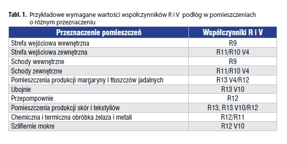 Wartości współczynników R i V można znaleźć w wytycznych [16]. Przykładowe wartości współczynnika R oraz V podłóg o różnym przeznaczeniu zamieszczono w tabl. 1.