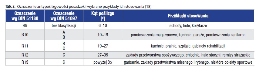 Aby posadzka mogła nosić miano antypoślizgowej i być oznaczona jako R9, zmierzony kąt krytyczny poślizgu musi wynosić minimum 6o. Klasa ta jest wystarczająca dla takich pomieszczeń zlokalizowanych wewnątrz budynku, jak schody, korytarze czy kuchnie i łazienki w mieszkaniach. Klasa R10, dla kąta poślizgu od 10o do 19o, przeznaczona jest zasadniczo do pomieszczeń magazynowych, garaży, pomieszczeń socjalnych w zakładach pracy, pomieszczeń sanitarnych – wszędzie tam, gdzie użytkownicy są narażeni na większą wilgoć i zabrudzenia przekraczające normalne użytkowanie. W pomieszczeniach o bardzo dużym obciążeniu spowodowanym stosowaniem znacznych ilości cieczy, olejów i smarów stosuje się klasę R11 – kąt poślizgu między 19o i 27o. Ostatnie dwie klasy antypoślizgowości R12 (kąt poślizgu 27-35o) i R13 (kąt poślizgu powyżej 35o) przeznaczone są do obiektów specjalnych. Klasa R12 jest wymagana w dużych kuchniach, zmywalniach, chłodniach czy pomieszczeniach obróbki mięs. Natomiast klasa R13 jest stosowana w pomieszczeniach o ogromnym natężeniu ruchu i wysokim