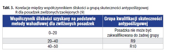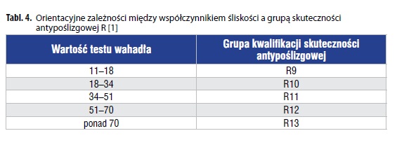 W tabl. 3 podano odpowiedniki parametrów śliskości uzyskanych na podstawie badań z zastosowaniem pochylni i wahadła angielskiego dla zwilżonych/ zaolejonych posadzek. W tabl. 4 podano takie korelacje na podstawie [1].