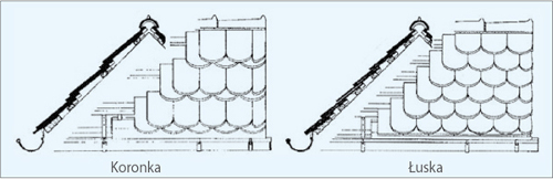Karpiówka ma szczególne właściwości i szczególne są wymagania dotyczą­ce jej stosowania: wymaga specjalnej konstrukcji dachowej. Jest to spowo­dowane jej wagą. Wbrew pozorom jest to najcięższe pokrycie. Waga jednego metra kwadratowego waha się w gra­nicach 60-70 kg. A zatem dach musi być zaprojektowany pod kątem właś­nie tej dachówki. Drugą jakże istotną sprawą jest to, że dachówka karpiówka w ogóle nie posiada zamków, co w zna­czący sposób ogranicza jej stosowanie na dachach o małym kącie nachylenia. Można stwierdzić, że te dachówki po­winny być kładzione na dachach, któ­rych spadek wynosi minimum 30 stop­ni. Producenci dopuszczają wprawdzie niższe wartości spadku, ale z mojego doświadczenia wiem, że nie zawsze się to sprawdza. Karpiówki można układać na dachach w dwóch wariantach – kry­cie w koronkę i w łuskę.