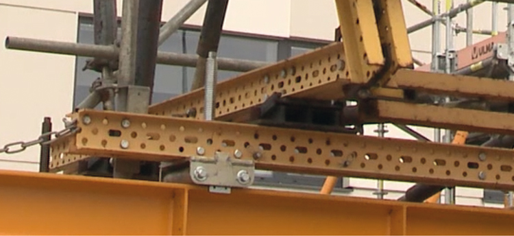 Ślizgi rozformowujące w trakcie betonowania powinny być zabezpieczone przed przesunięciem za pomocą dwóch sworzni E20x70, które w fazie opuszczania deskowania należy każdorazowo wyjąć, umożliwiając przesuw (fot. 2).