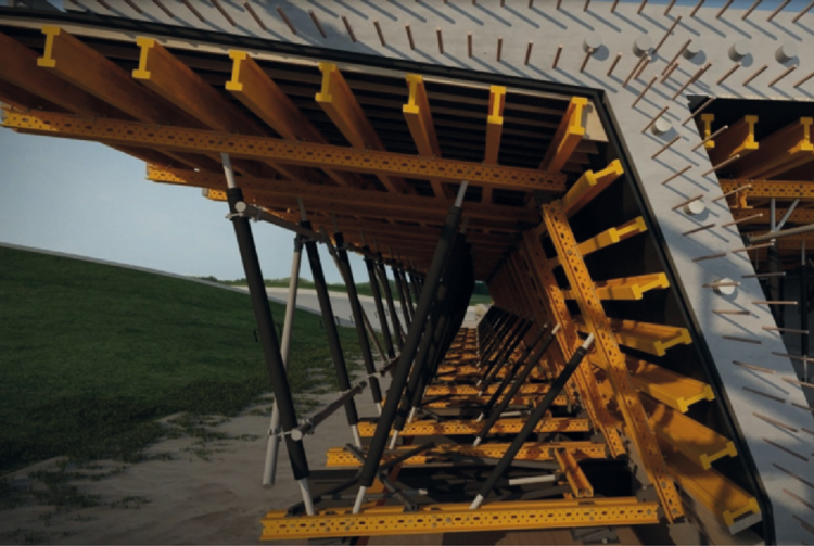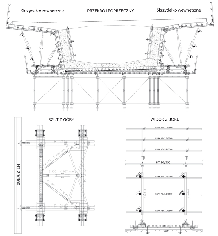 Deskowanie przejezdne, czyli rama przestrzenna formująca kształt ustroju nośnego, zostało zbudowane z profilu M120 i dźwigarów drewnianych VM 20 połączonych za pomocą złączy i podpór systemowych oraz układu jezdnego (rama ślizgowa). Długość zaprojektowanego segmentu (podpartego w czterech punktach) – 3,6 m. Schemat zastosowanego deskowania przedstawia rys. 4.