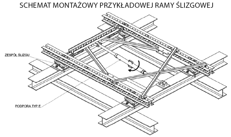 Konstrukcja ramy ślizgowej wykonana jest z elementów systemu MK, podstawowymi elementami są podpory E i zespół ślizgu. Przemieszczanie deskowania jest wspomagane przez skracanie długości śruby rzymskiej umieszczonej poziomo w ramie z zespołu ślizgu (rys. 5).