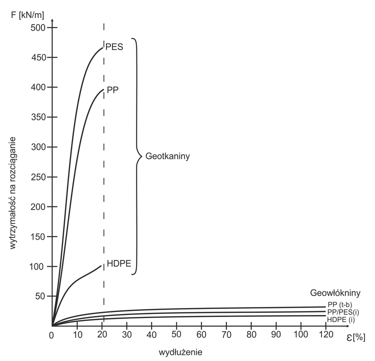 Rys. 4. Wykresy wytrzymałości geotkanin i geowłóknin a ich wydłużenie; HDPE – polietylen o wysokiej gęstości