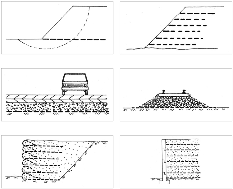 Umiejętne wykorzystanie ich właściwości pozwala na w pełni satysfakcjonujące projektowanie nie tylko zbrojenia podstawy nasypów w ekstremalnych warunkach, ale także budowę murów oporowych i stabilizacji stromych skarp. Wiele ośrodków naukowych i badawczych zajmuje się wyborem i analizą poszczególnych przypadków wzmacniania podłoży gruntowych, i to tych dotyczących szczególnie nasypów.