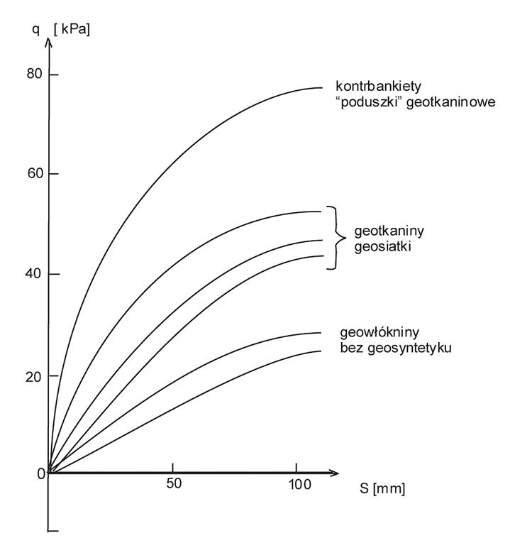 - efekt zamkniętej „poduszki” geotkaninowej jak również zastosowanie kontrbankietów jest najbardziej optymalnym wariantem wzmocnienia podłoży nasypów drogowych, kolejowych, wałów przeciwpowodziowych itd.;