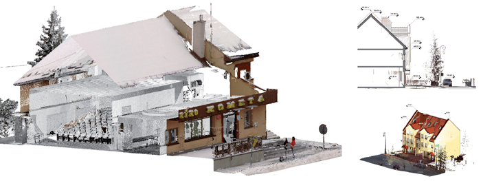 Innym ciekawym zagadnieniem było opracowanie koncepcji budynku przy istniejącym już obiekcie sąsiednim. Projektowany obiekt miał nawiązywać wysokościowo do istniejącego obiektu oraz tworzyć z nim pierzeje ulicy. W tym przykładzie zostały wykonane trzy ujęcia pozwalające uchwycić najważniejsze wymiary geometryczne istniejącego obiektu. Oczywiście, dostaliśmy w prezencie o wiele więcej: wpisując chmurę punktów w oprogramowanie oraz umieszczając ją w układzie wysokościowym nawiązującym do punktów osnowy geodezyjnej otrzymaliśmy układ wysokościowy – spadki istniejących ulic oraz układ wysokościowy terenu będącego w zakresie opracowania w odniesieniu do istniejącego i projektowanego obiektu, a także, co najważniejsze, wysokości charakterystycznych elementów: gzymsów, okien, podcieni. W takiej sytuacji trudno o pomyłkę, wszystko jest widoczne od samego początku.